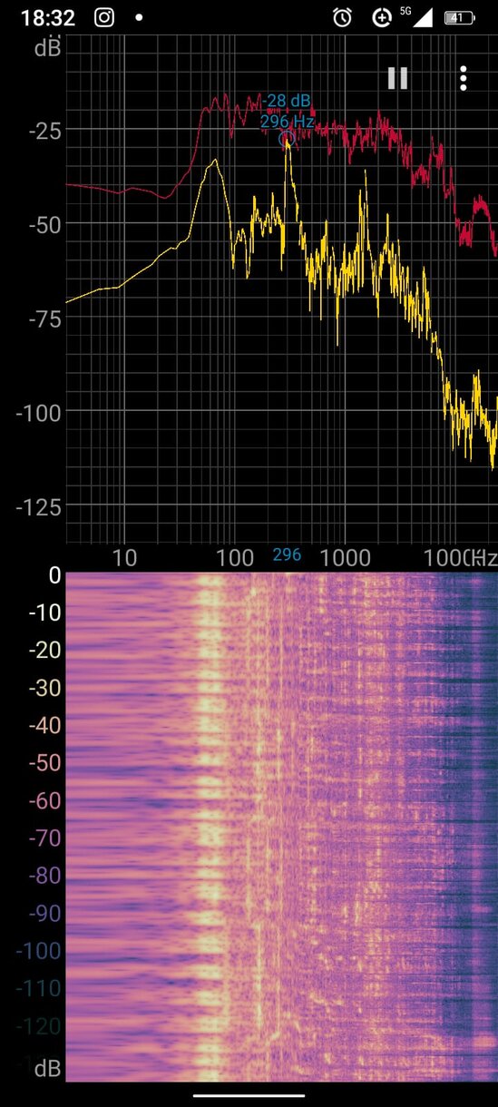 A leitura em 296 Hz e –28 dB revela uma banda que domina o palco e entende o som — limpo, controlado e coerente com o ambiente.